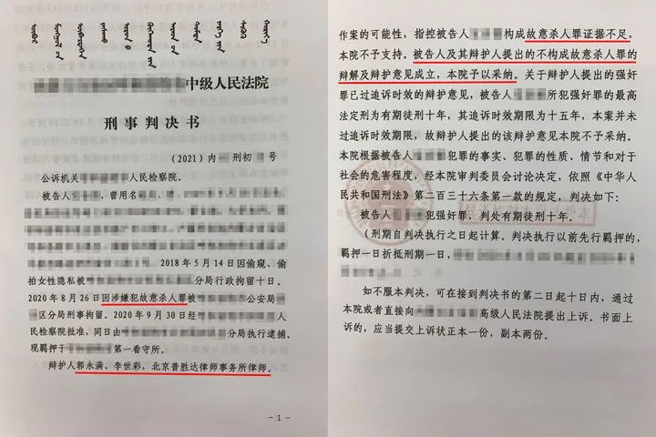 最终,法院采纳了郭永满律师的意见,对被告人宝某某犯强奸罪判处有期徒刑十年,故意杀人罪不成立。